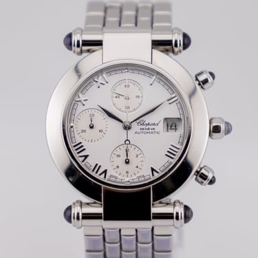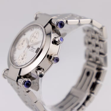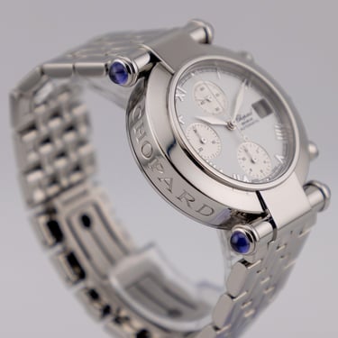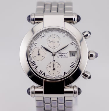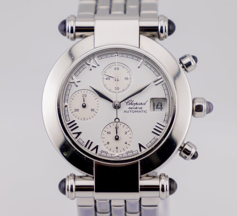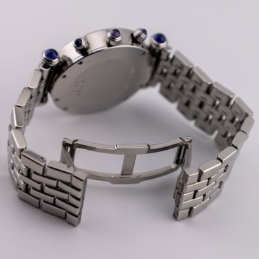 Plus de détails : Montre Chronographe Automatique à 3 compteurs / Poussoirs de Chrono et Couronne sertis de Saphirs / Bracelet Acier avec attaches serties de Saphirs