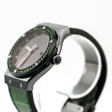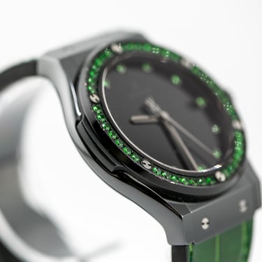 Matière : Boitier Céramique / Lunette sertie de tsavorites / Bracelet Alligator