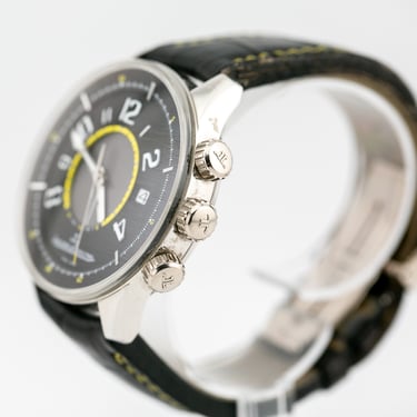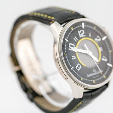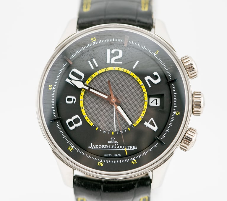 Cadran : Noir avec disque central guilloché ardoise, effet « tableau de bord » / chiffres arabes luminescents / index en acier appliqués / Anneau interne jaune pour réglage de l’alarme
