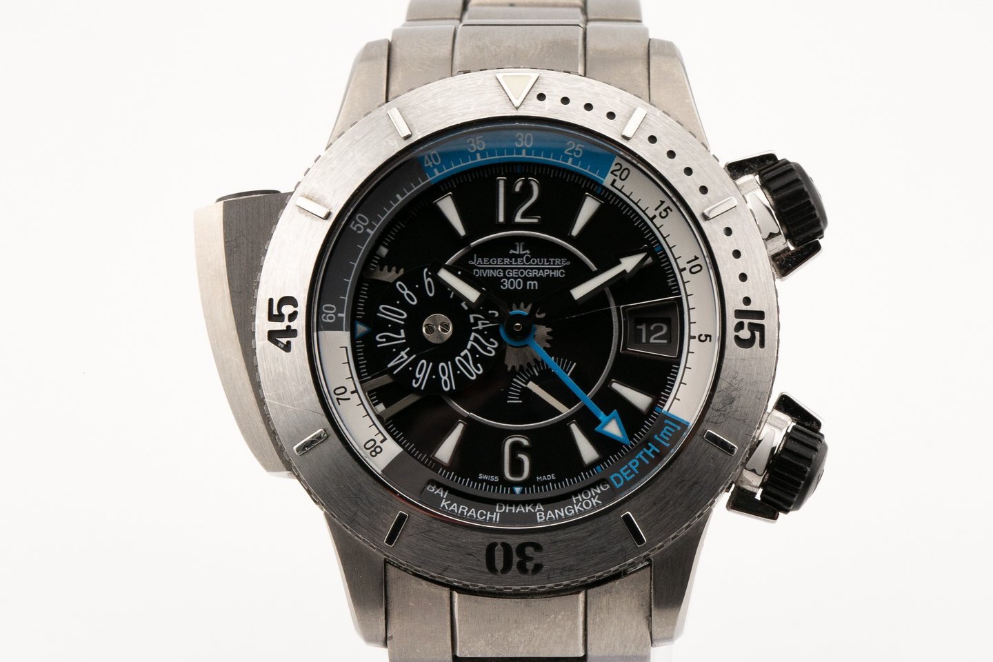 Fonctions : heures, minutes, seconde, deuxième fuseau horaire sur 24 heures sélectionné à partir de 24 villes, date, indicateur de marche, lunette tournante unidirectionnelle. Profondimètre mécanique. Poussoirs vissés