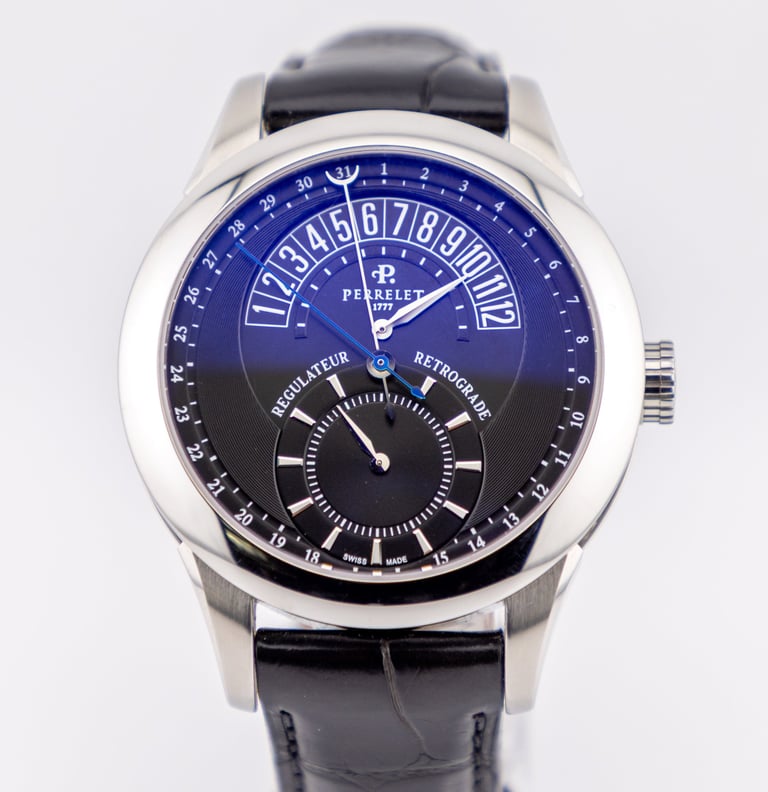 Cadran : Cadran Noir à Index 2 compteurs / Lecture de l’heure à midi / Minutes à 6h / Lecture de la date sur le Cadran