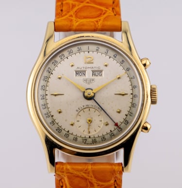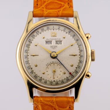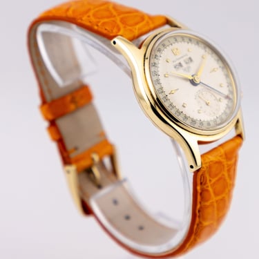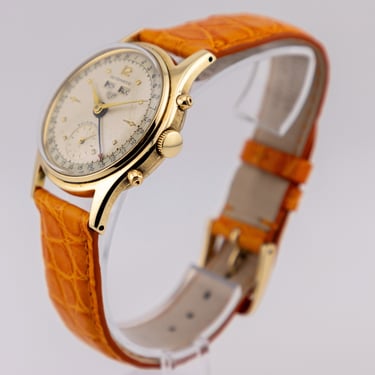Cadran : Cadran Argenté Patiné d’origine / Index appliqués clous et aiguilles lance Or jaune / Petite Seconde à 6h / Date autour du cadran indiqué par une aiguille rouge / Jour et Mois à midi